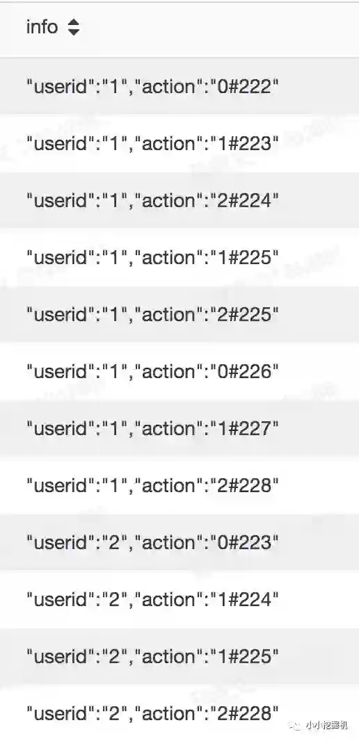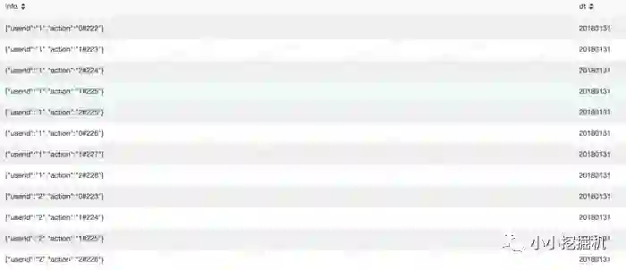为了模拟我们的hive函数,我们特地将info字段写成了一个json格式,info中有两个键值对,一个是user_id,另一个是用户的行为,行为中有两个数据,用#隔开,分别是动作的类型和动作发生的时间。我们可以这样认为,0代表百度首页,1代表进行了一次搜索的搜索结果页,2代表查看搜索结果中国年的某个详情页。从一次动作0 到 下一次动作0,我们可以认为这是用户和百度一次完整的交互,即一次session,从一次动作1到下一次动作1,可以认为是一次完整的搜索操作。另一个字段是dt,即我们的分区字段。