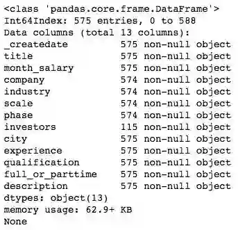 可以看到,经过初步清理后,数据集中有效变量为13个,数据记录575条。除了投资人这一项之外,其他各字段的数据完整度非常好,几乎没有缺失值。这对于后面的分析来说是个大大的好消息。