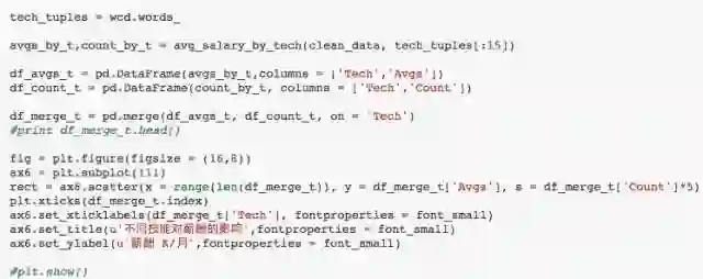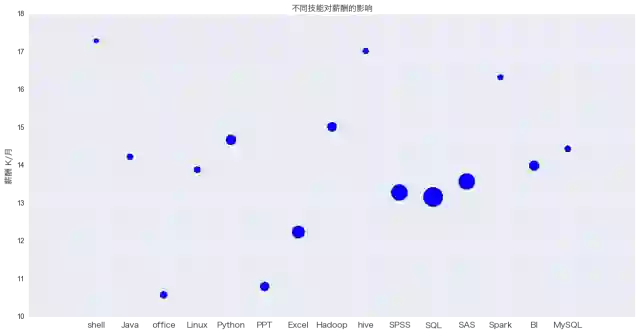 我对需求频率最高的前15个技能进行统计计算,得出每一个技能对应的平均薪酬水平,如上图。点的大小代表该技能需求量的多少。