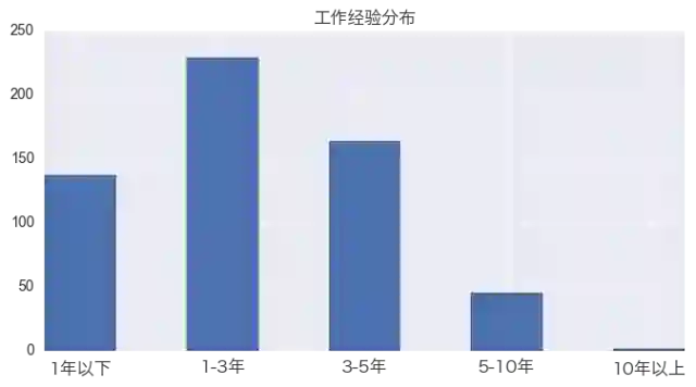 不出所料的,工作经验的需求分布近似于正态分布。工作1-3年经验的熟手需求量最大,其次是3-5年工作经验的资深分析师。工作经验不足1年的新人,市场需求量比较少。另外,工作经验要5-10年的需求量非常稀少,而10年以上的更是凤毛麟角。