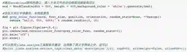 本项目主要分为两大部分,第一部分是数据爬取,采用的是集搜客网络爬虫工具。第二部分是数据分析,以python编程语言为基础。数据分析部分主要使用pandas作为数据整理和统计分析的工具,matplotlib用于图形的可视化,seaborn库包用于图形美化。在进行技能需求分析的时候,使用了jieba作为分词工具包,并使用wordcloud包制作词云。