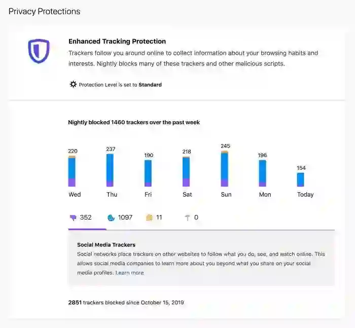此外,Firefox 70添加了新的隐私报告,通过从Firefox主菜单中选择“隐私保护”可以访问该报告。这提供了您当前保护级别的摘要,并显示了过去一周中每天有多少跟踪器被阻止的图表(分为ETP提供的五种保护类别)。