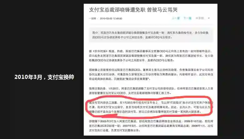 2010年,支付宝其实就是一个电商工具,服务淘宝支付,但当时发生了一件什么事儿呢?支付宝总裁被免职,媒体称马云曾批评其产品“烂到极点”,用户体验太糟糕,支付宝太保守,毫无进步。