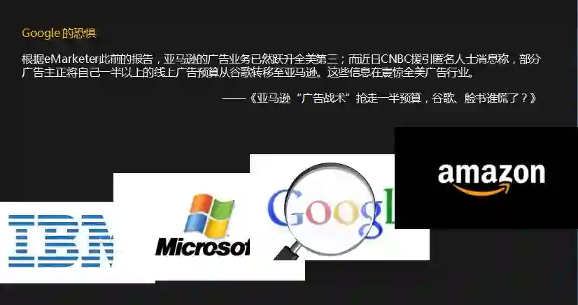 你看,IBM是一个硬件公司,微软是一个软件公司,Google是一个互联网服务的公司,但战争结束了吗?没有啊,Google现在最大的恐惧是什么?可能不是流量上跟他有竞争的Facebook,而是突然发现,广告主把预算都移走了。移到哪儿去了?移到了亚马逊去。
