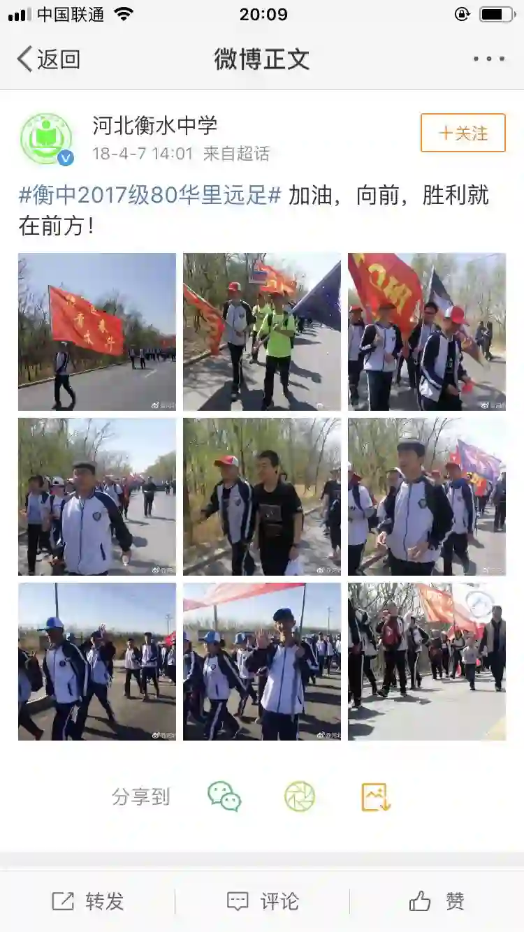 很多学校学习衡中的还有诸如集体远足这样的活动。每年,衡中所有的高一同学都会在五一放假前,步行40公里往返衡水湖景区,以这样的“迷你长征”来磨炼学生的意志力,很多人脚上都会磨出水泡。