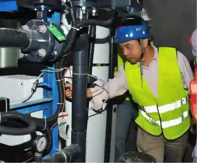 王贻芳在大亚湾中微子实验站察看设备安装情况,图片来源:高能物理所