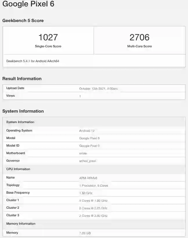 据 Geekbench 信息显示,谷歌 Pixel 6 配备 8GB RAM,搭载 Android 12 操作系统,单核跑分 1027,多核跑分 2706。此外,该机还拥有 Mali G78 GPU。