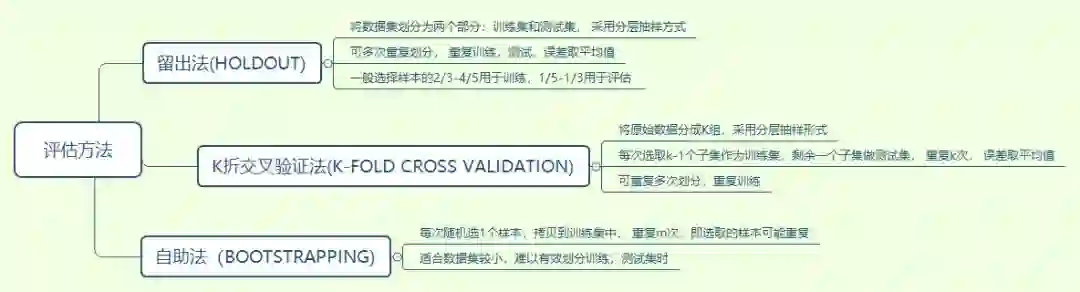 常见的模型评估方法有留出法,k折交叉验证法和自助法: