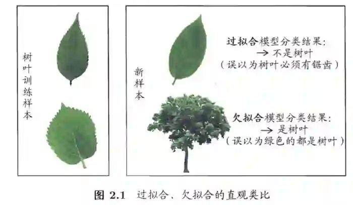欠拟合和过拟合都是模型泛化能力不高的表现。欠拟合通常表现为模型学习能力不足,没有学习到数据的一般规律。而过拟合则是模型捕捉到数据中太多的特征,以至于将所有特征都认为是数据的一般规律。如下图树叶的示例很形象的表达了欠拟合与过拟合。