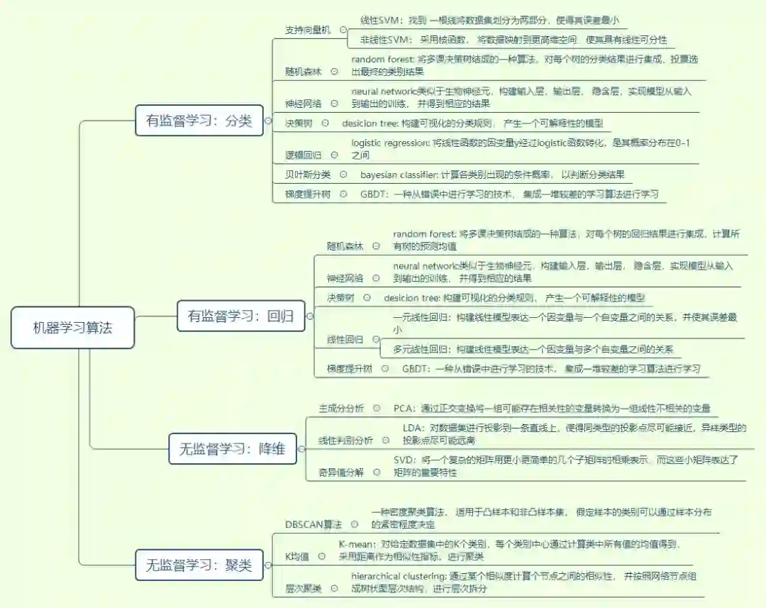 我们将一些算法模型整理成如下思维导图的形式,并对相关算法的基本思想做了简单阐述。