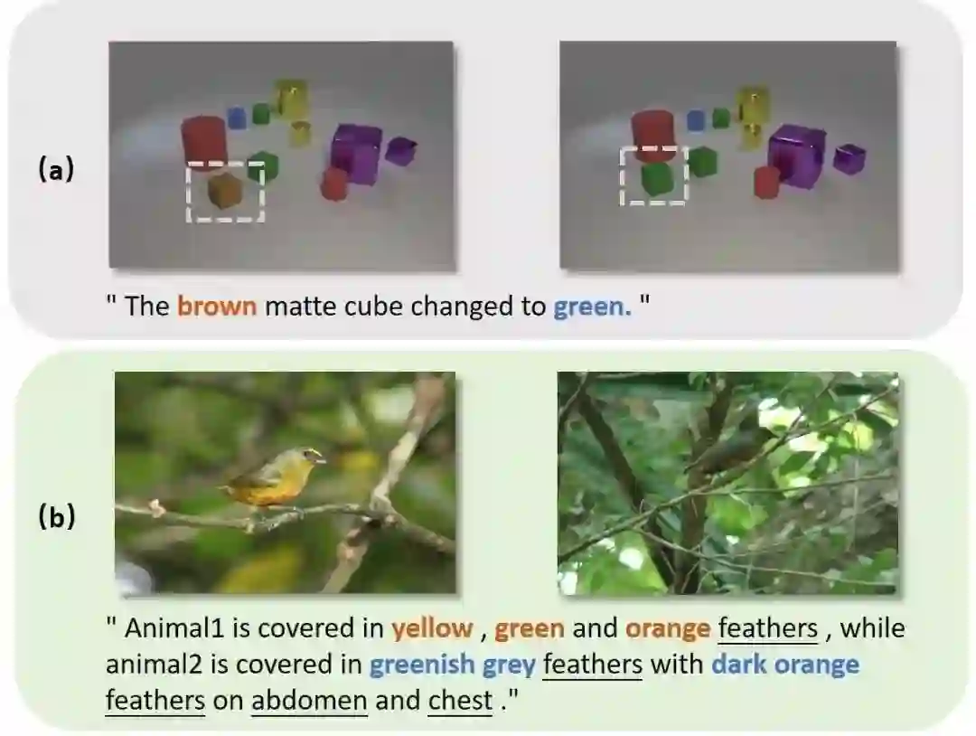 图像差异描述生成(Image Difference Captioning,简称IDC) 的目标是对比两张相似图片、捕捉它们之间的视觉差异,然后用自然语言将这些差异描述出来,如图1所示。相比于经典的图像描述生成任务(Image Captioning, 为一张图片生成内容描述),它涉及两张相似图片的内容理解与对比,更富有挑战性。这个任务在现实生活中有广泛的应用,比如协助鸟类学家区分并记录相似的鸟类品种,自动检测和描述监控视频中的场景变化等等。