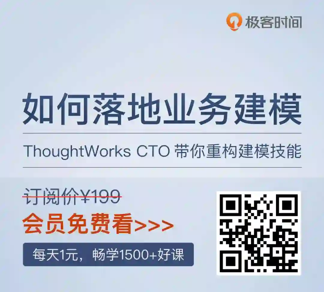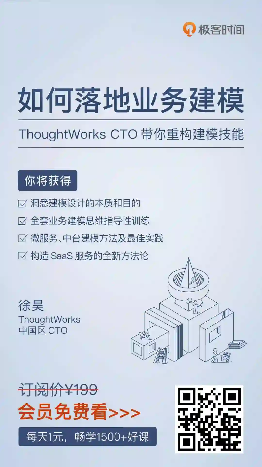 发现没有,能否做到有效定义问题,对开发者尤为重要,因为这背后甚至可以是几天跟几小时的开发耗时区别,而这个能力也是业务建模能力中的关键一环。想提升定义问题的能力,锻炼个人思考力,全面提高架构开发效率等,推荐你看看徐昊的《如何落地业务建模》专栏。