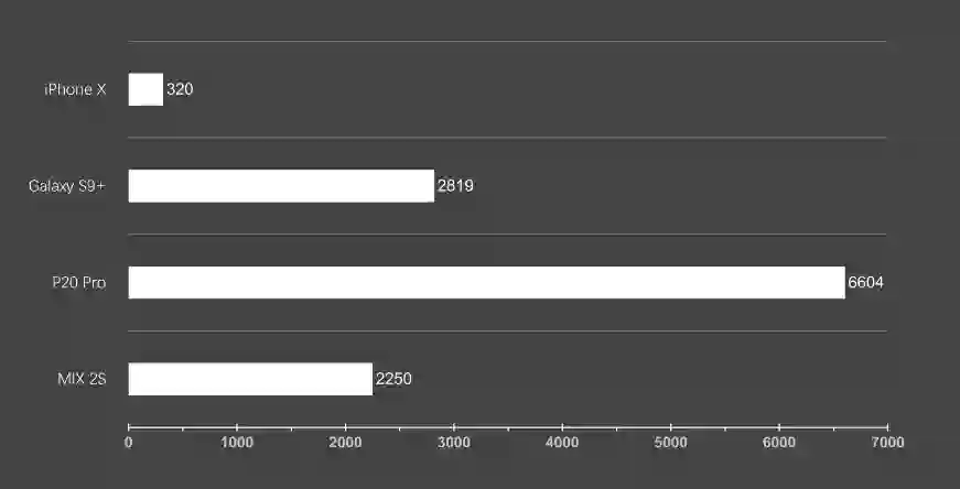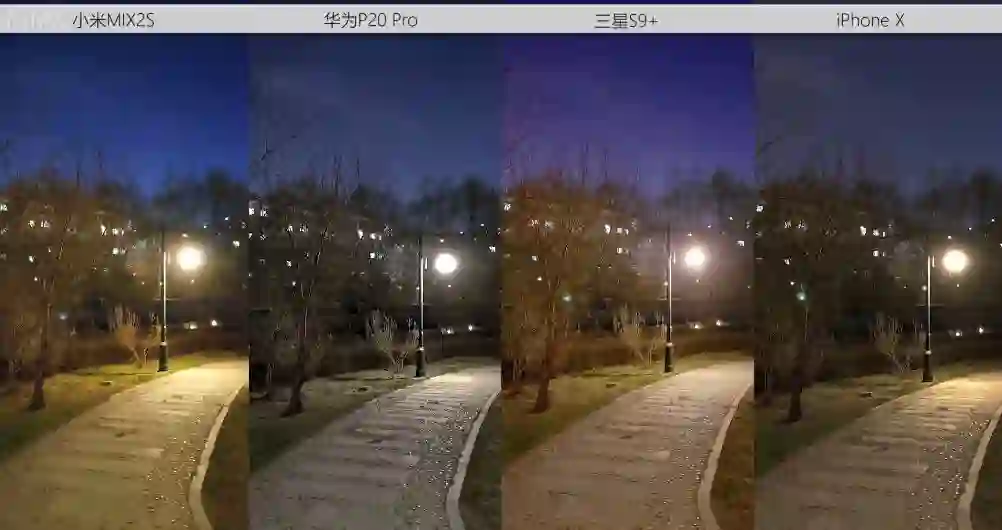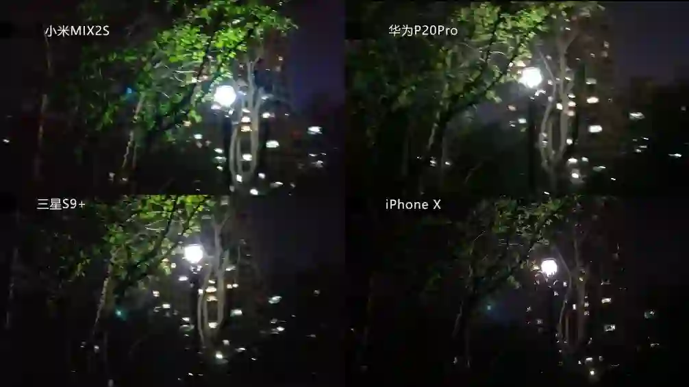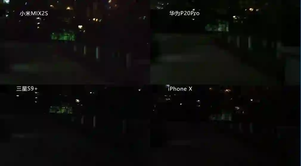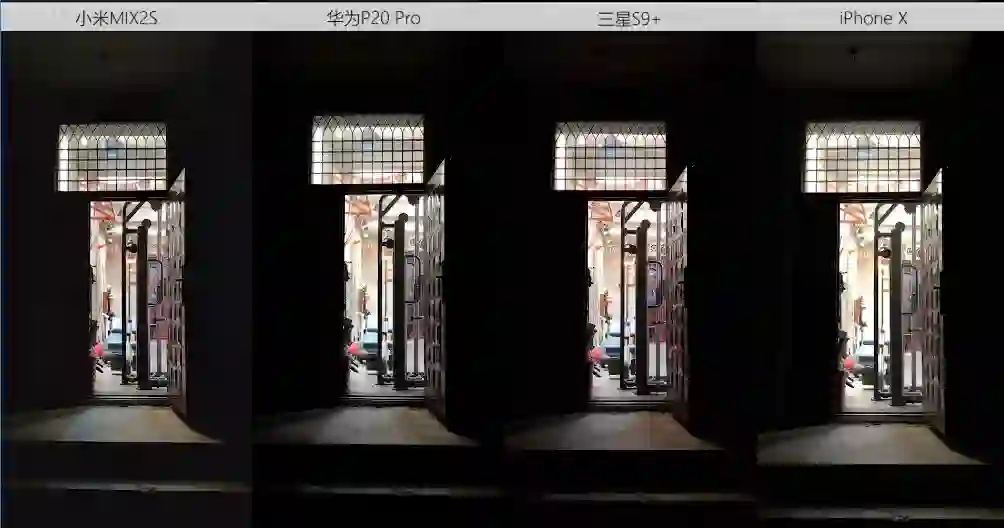 测光和对焦,光线充足的时候,4台机器没有区别,都很迅速。光线不足的时候,可以看到4台机器的取景都高于人眼观测的亮度,P20 Pro出色的对焦表现又快又准,多组测试的结果可以重复验证,Galaxy S9+、MIX 2S随后,偶尔有拉风箱的情况,iPhone X多次无法对焦。