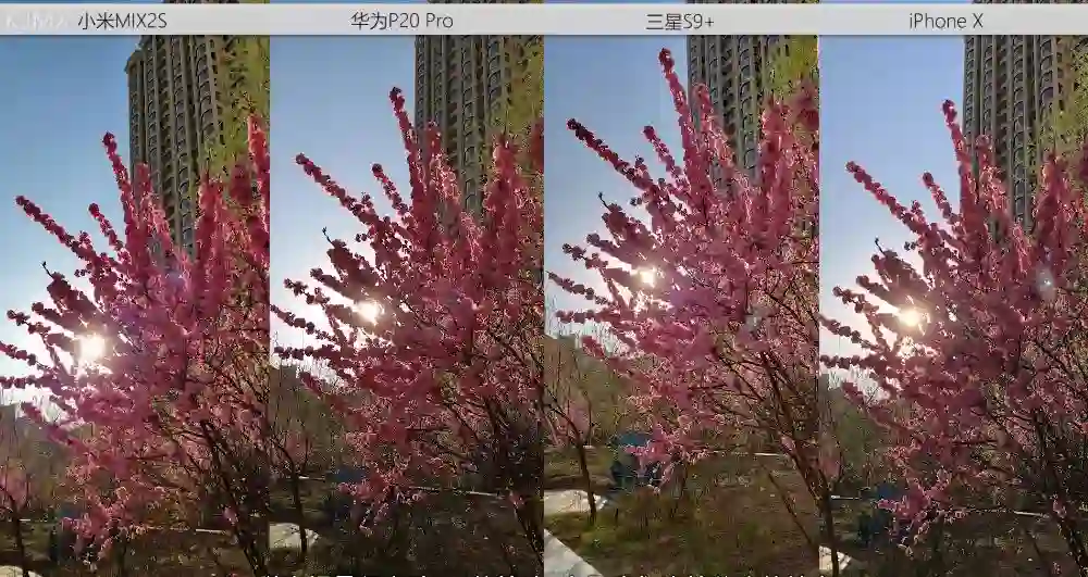 Galaxy S9+赢的当之无愧,绝佳的动态范围让其他3个黯然失色,在茂密的花丛、透过的阳光和远方的建筑中取得曝光度和解析力的完美平衡。MIX 2S和Galaxy S9+的差距不小,不过丁香花丛的曝光比iPhone X、P20 Pro好上一点。