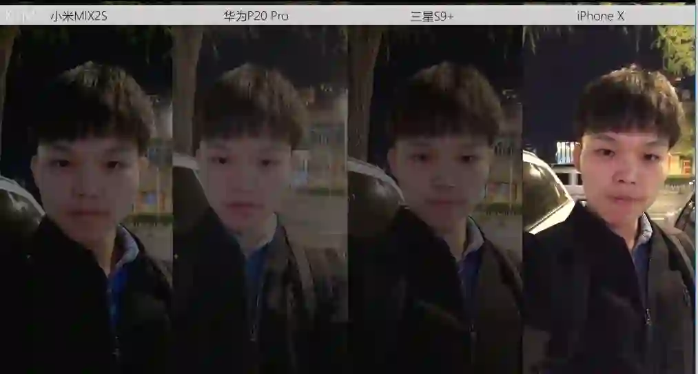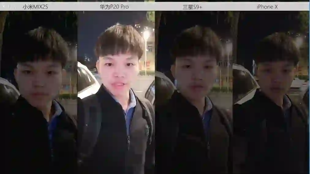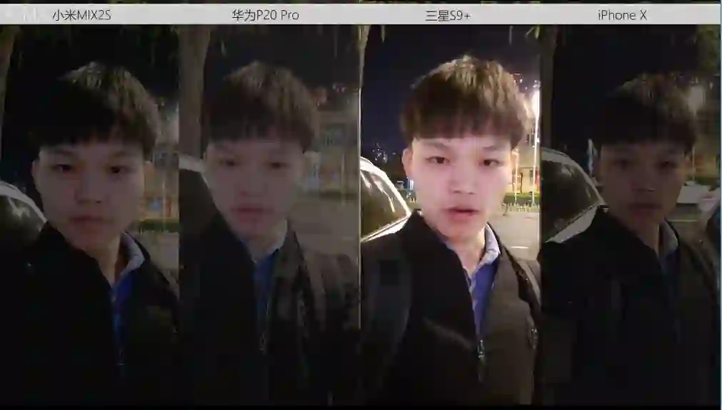 晚上前置相机录像方面,MIX 2S声音最大,和上篇录音环节的表现接近,Galaxy S9+的效果最清晰,P20 Pro附加有美颜的功能。