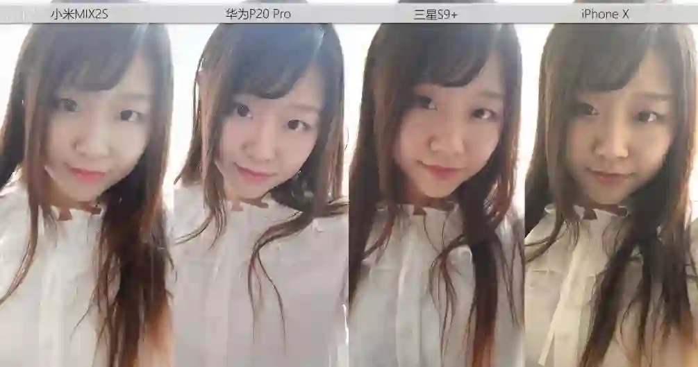 除了P20 Pro还看的清窗外的环境,Galaxy S9+只剩一个角落,MIX 2S和iPhone X更是白茫茫的一片。抛开这个,P20 Pro的美化效果也清新可人,2400w像素的前置相机对细节的修正也更从容。Galaxy S9+的美颜在国际大厂中向来厚道,只是和本地选手P20 Pro存在不小的差距。500w像素的MIX 2S只可以赢iPhone X,希望MIX 2S在这个方面多花些心思。