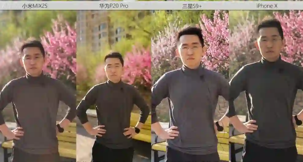 不论虚化的如何,至少Galaxy S9+略施粉黛的成像风格很漂亮。Galaxy S9+的景深不算很浅,但是比较自然,抠图也最细致。P20 Pro和MIX 2S都是比较“假”的一类,虽然P20 Pro略微胜出,不过手臂中间的耳机线、手表的边缘都出现穿帮。MIX 2S收敛一些,只是左臂的抠图有失误。iPhone X的各个方面兼顾,除了人不太好看,可惜这是人像模式的比拼。