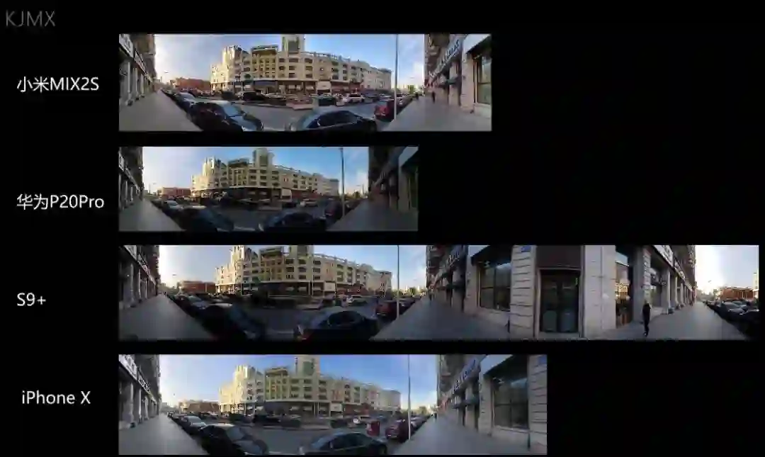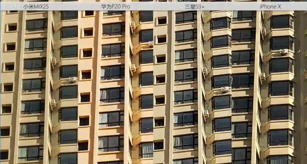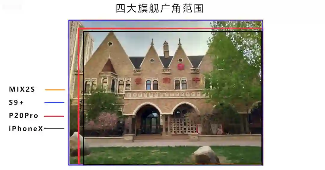 广角方面,Galaxy S9+和MIX 2S的等效26mm居首,取景范围比等效27mm的P20 Pro多出一段,等效28mm的iPhone X排在最后。