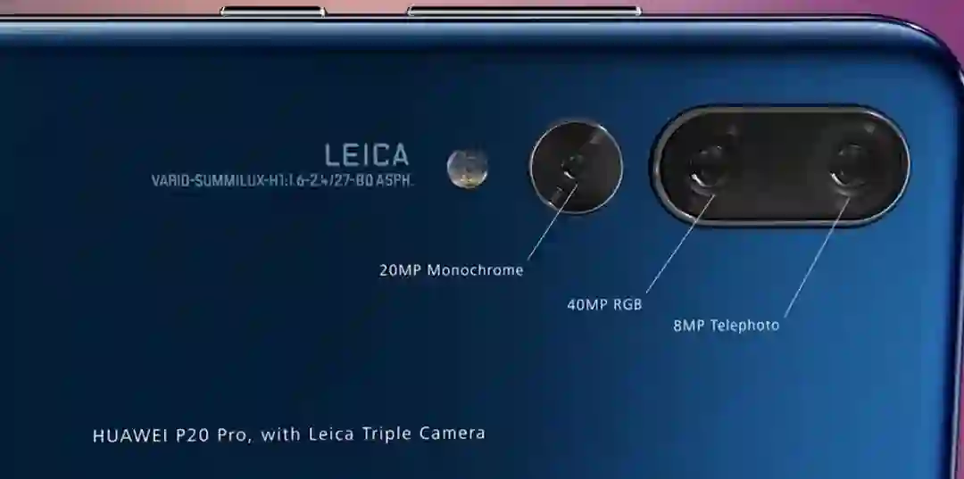 P20 Pro的后置相机从上到下依次是800w像素光变镜头、4000w像素彩色镜头、2000w像素黑白镜头。