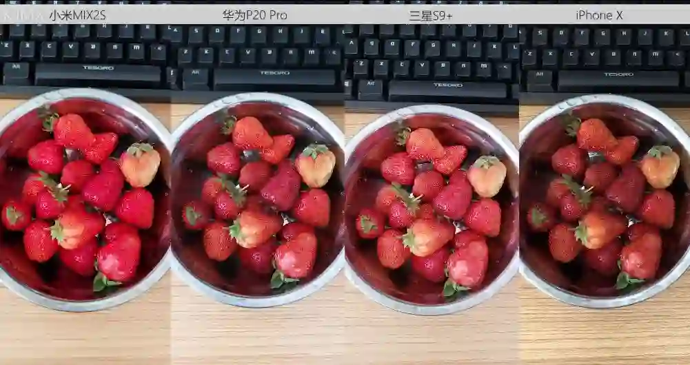 MIX 2S这红彤彤的草莓,不太真实,红色还有溢出,不过大家还是把票投给了它。从观感来看,Galaxy S9+和P20 Pro更好,不淡不浓,刚刚好,它们的得票数也非常接近,而且放大以后,Galaxy S9+和P20 Pro都要超过MIX 2S。iPhone X的草莓看了都不想吃,略过。