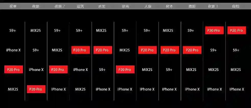 P20 Pro继Mate 10 Pro之后,又一次杀入4大旗舰的核心地带,总体表现非常稳定,AI摄影大师的场景优化也很到位,不过个别场景AI滤镜有点过分了,导致第一名只有两个场景,第二名最多,有5个。应该说综合表现很好,很稳定,这真的是很大的进步。