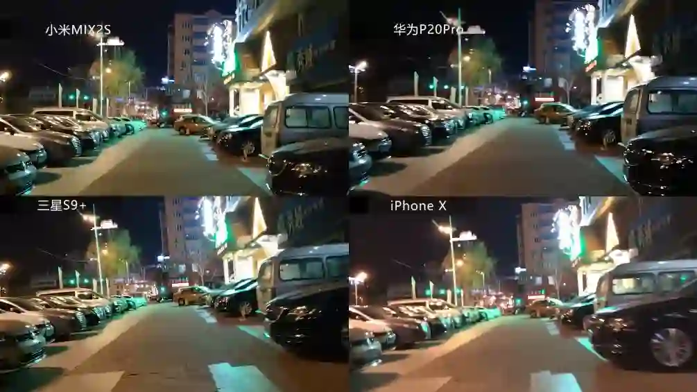 晚上的时候,MIX 2S取景亮度最高,但是偏色和涂抹感比较严重。P20 Pro和Galaxy S9+的视频风格和照片一样,并且伴有拖影的现象。