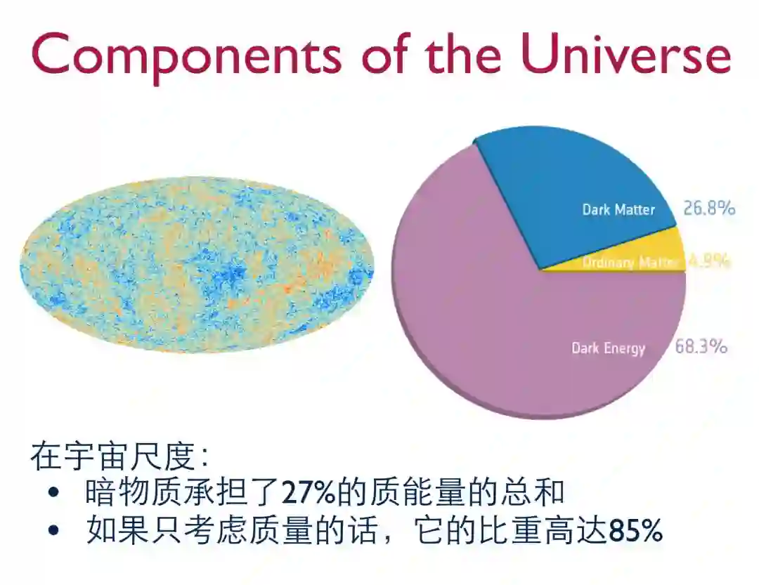 二十世纪70年代,美国天文学家Vera Rubin对星系旋转曲线进行了研究,发现在远离星系中心的区域恒星和气体粒子依然维持平直的旋转曲线,和可见物质分布的预言产生矛盾。上世纪后期,宇宙学对微波背景辐射的测量,显示出宇宙演化初期由暗物质的不均匀分布而造成的温度涨落分布,提供了暗物质存在的另一个证据。根据目前研究,暗物质组成了宇宙27%的质能,远大于可见物质所占的5%。如果只考虑质量的话,它的比重高达85%,暗物质在宇宙演化中起到关键作用。