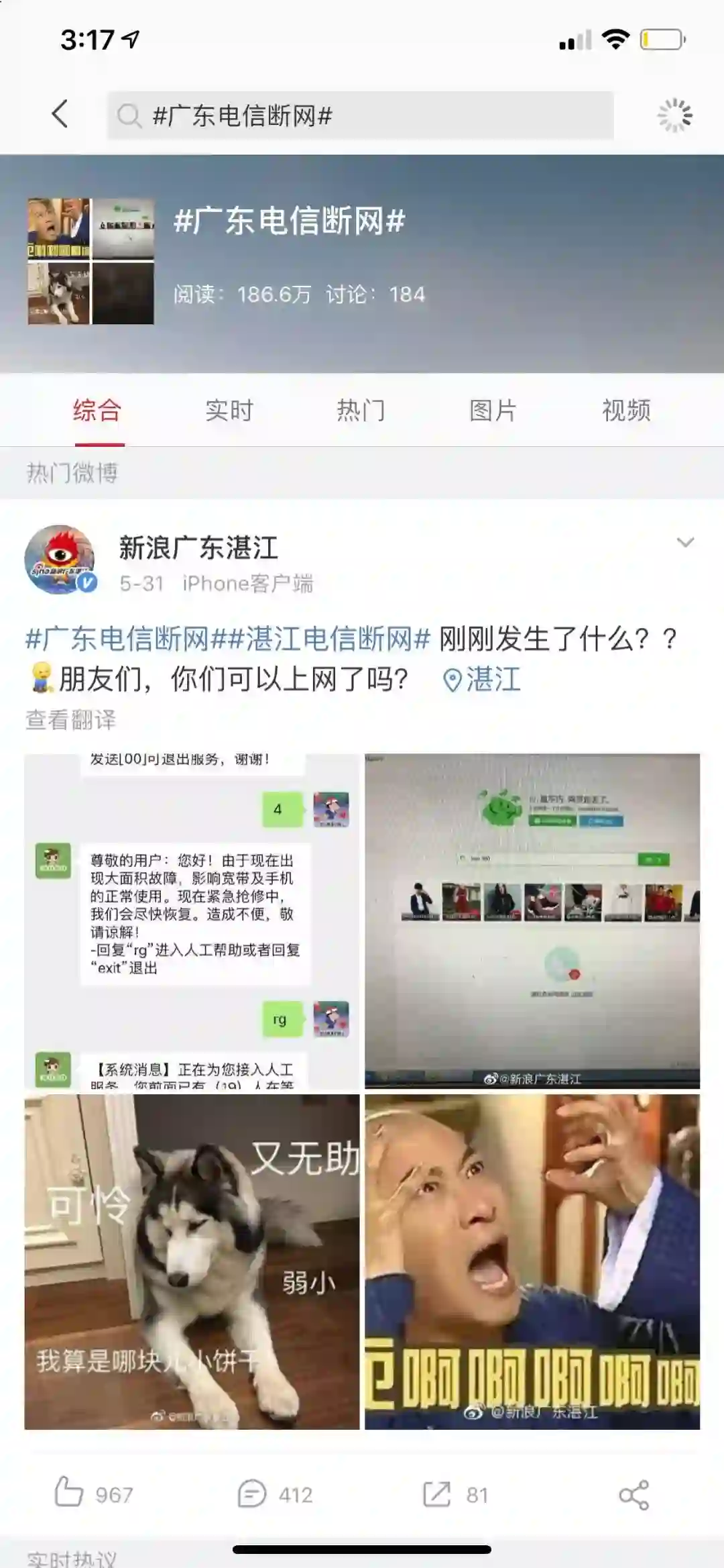 5月31日,广东电信发生大规模故障,大量网友在微博吐糟,影响用户宽带及手机的使用。
