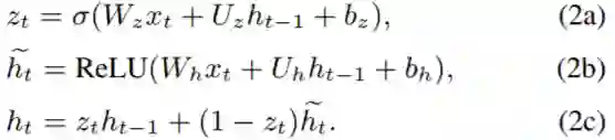 移除重置门并且使用 ReLU 激活函数替代 tanh 后,我们可以得到新的公式: