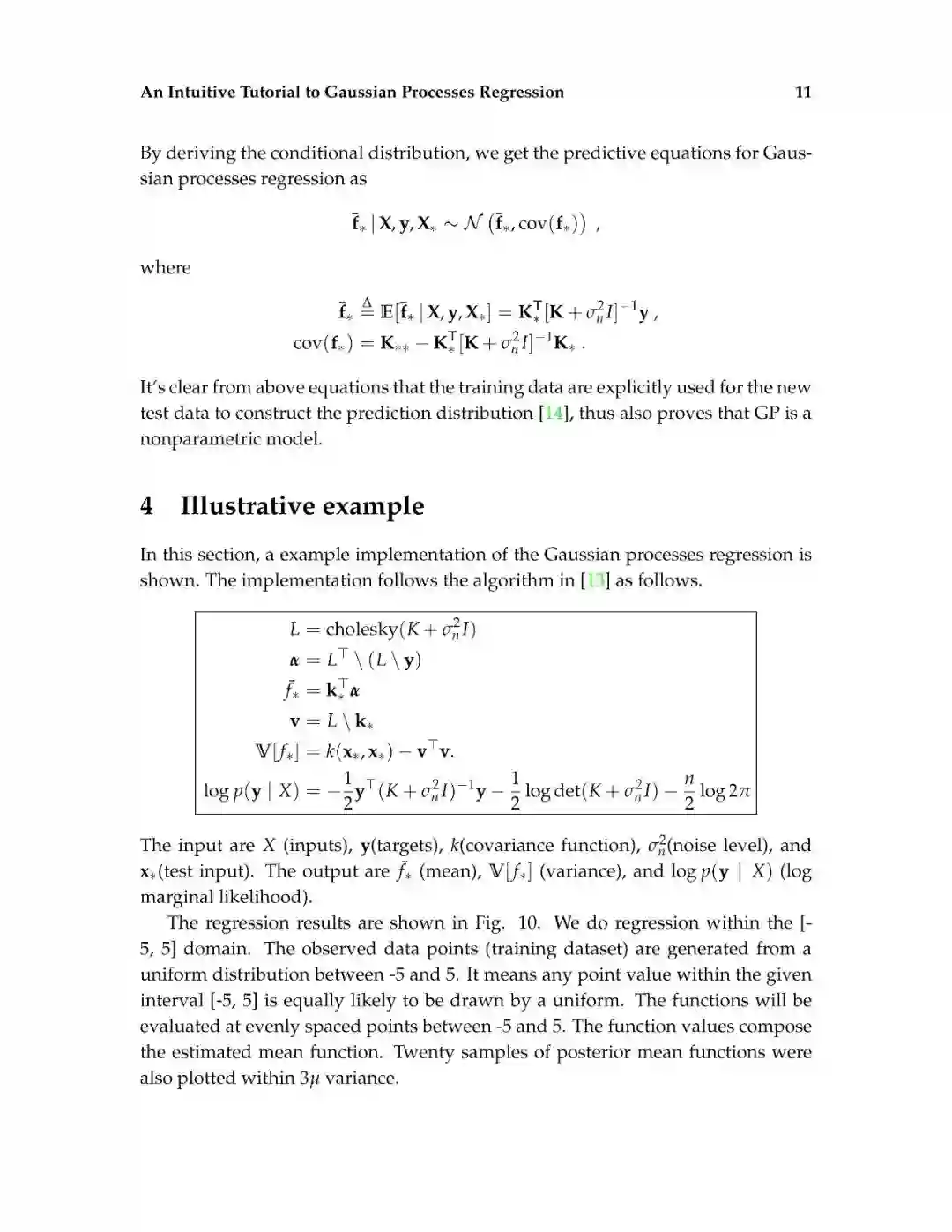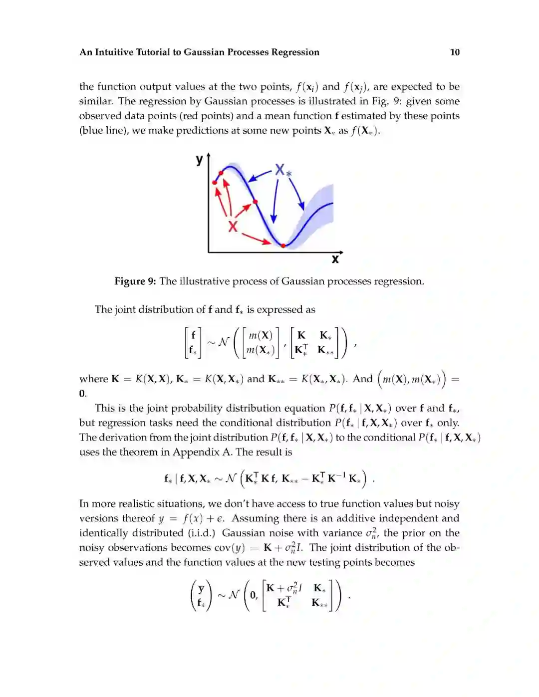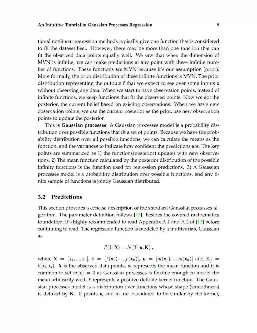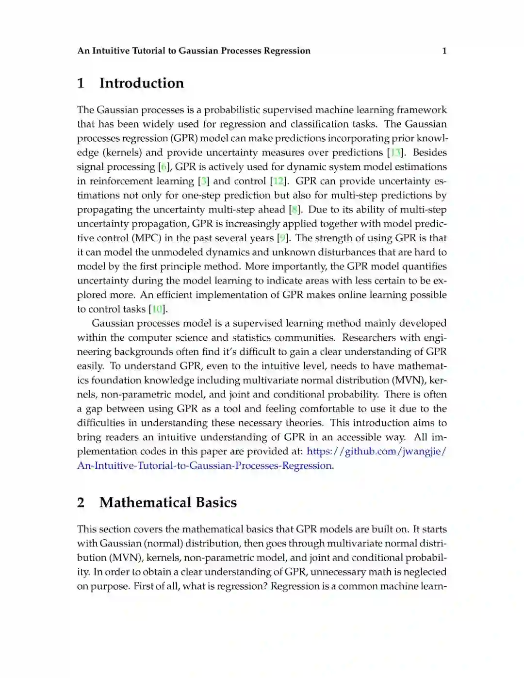 这篇介绍旨在为读者提供对高斯过程回归的直观理解。高斯过程回归(GPR)模型由于其表示法的灵活性和预测的固有不确定性,在机器学习应用中得到了广泛的应用。本文首先解释了高斯过程所建立的数学基础,包括多元正态分布、核、非参数模型、联合概率和条件概率。然后,通过显示不必要的数学推导步骤和缺少关键的结论性结果的平衡,以可访问的方式描述高斯过程回归。给出了一个标准高斯过程回归算法的说明性实现。除了标准的高斯过程回归之外,现有的软件包实现了最先进的高斯过程算法。最后,给出了更高级的高斯过程回归模型。这篇论文的写作方式通俗易懂,理工科本科学生理解文章内容不会有困难。