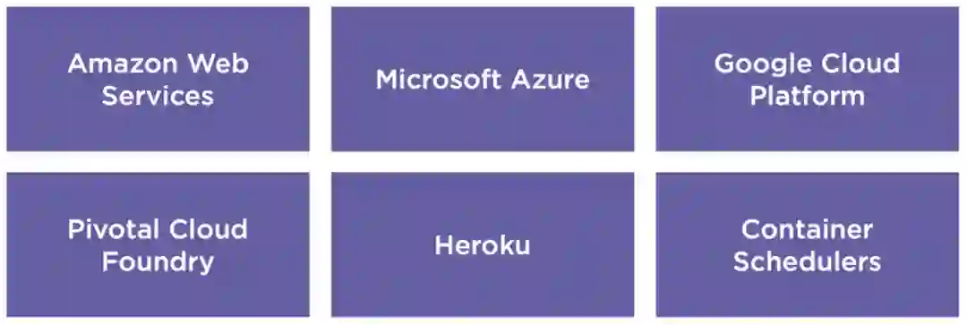 云平台主要是为了自动化、观察软件的运行时,目前业内常用的云平台包括 Amazon Web Services、Microsoft Azure、Google Cloud Platform、Pivotal Cloud Foundry、Heroku 和 Container Schedulers。