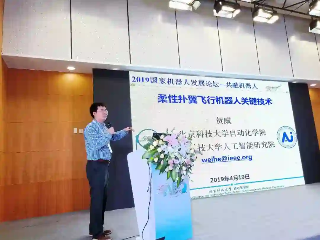 北京科技大学贺威教授的报告题目是“柔性扑翼飞行机器人关键技术”。贺教授指出,柔性扑翼飞行机器人是受昆虫和鸟类飞行方式启发的一类飞行机器人,与常见的固定翼和旋翼飞行器相比,柔性扑翼飞行机器人具有质量轻、效率高、机动性强、能耗低等优点,是飞行机器人发展的重要方向。扑翼飞行机器人的翅膀一般采用柔性结构,在飞行中受到气流作用会产生预期之外的振动和形变,从而影响飞行性能,甚至缩短使用寿命。