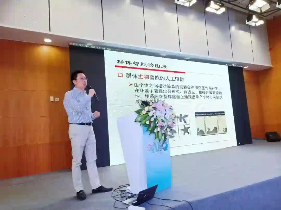 国防科技大学易晓东教授在题为“群体机器智能初探”的报告中,针对群体机器智能的特殊性,受生物群体进化的“三角法则”启发,提出群体机器智能的结构性、适应性和涌现性等特性,并针对三个特性探索了破解群体机器智能机理的初步思路。最后凝炼了群体机器智能的科学问题,并落实到群体智能机器人操作系统的研究中。