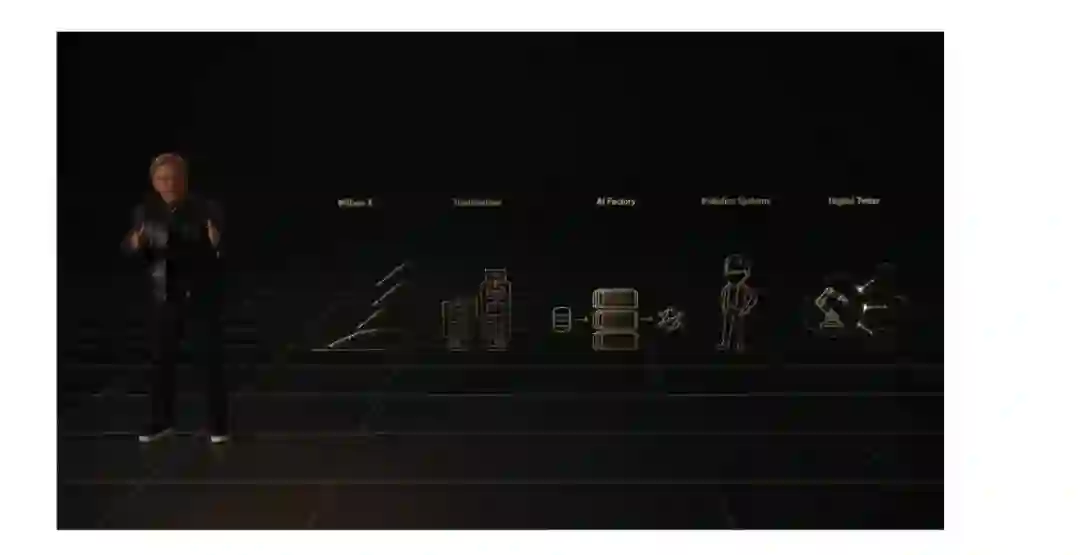 此外,黄仁勋又介绍了重塑行业面貌的五大动力:百万倍计算提速、transformers 加速 AI、数据中心转 AI 工厂、对于机器人系统的指数级需求增长,以及 AI 次世代下的数字孪生。