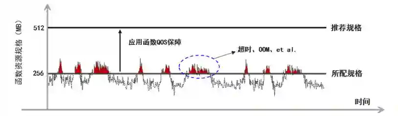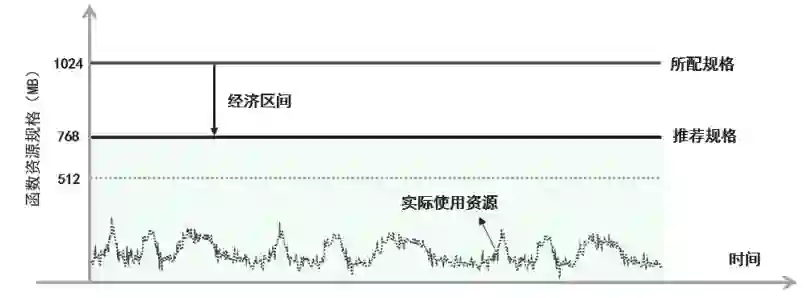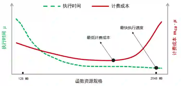 最后讨论函数资源规格的选择问题。从公式(2)明显可以看出,更大规格的实例内存 对应更高的计费成本。但内存规格的选择,需要同时考虑对函数执行时延 的影响。从用户函数的角度看,函数执行时延除了由代码本身的业务逻辑决定之外,还受实例运行时可使用资源大小的影响。更大的实例规格,对应更大的可使用内存和更多的 CPU 份额,从而可能显著改善高内存占用型或 CPU 密集型函数的执行性能,降低执行时延;当然,这种改善也存在上限,超过某个资源规格后,资源的增加对降低函数执行时延的效果几乎可以忽略,如图 7 中虚线所表示的过程。上述事实表明,对于给定的用户函数,为降低总计费成本,需要配置合理的实例规格,使得