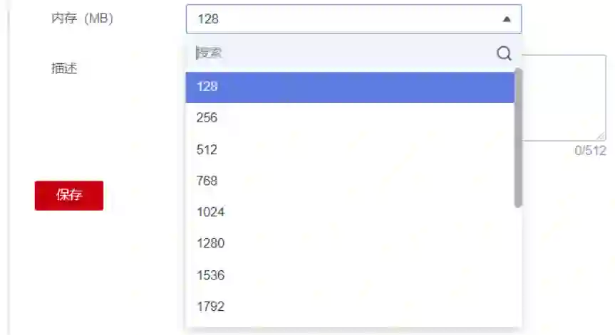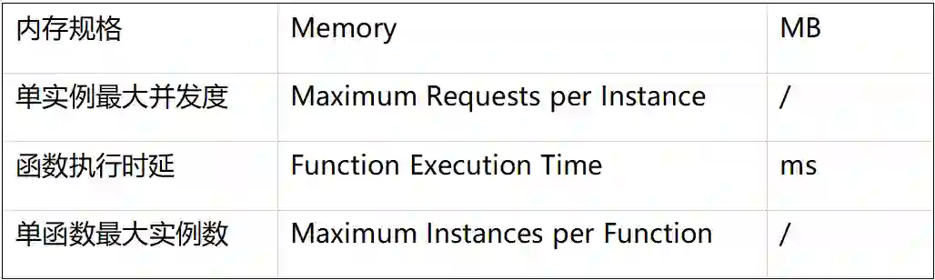 内存规格 (Memory):内存规格也即函数规格、函数实例规格,表示 Serverless 平台为函数的单个实例所分配的资源大小,一般表示为函数可使用的内存大小,由用户指定;实例可使用的 CPU 份额与内存大小成正比。Serverless 云平台通常提供多种规格供用户选择,以 FunctionGraph 为例,用户可选 15 种函数规格,如图 1 所示。
