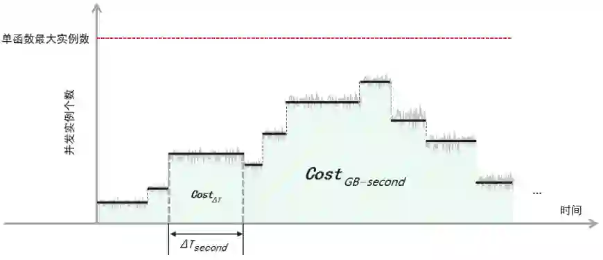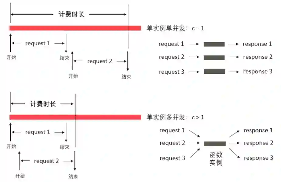 单实例最大并发度 (Maximum Requests per Instance):函数的单个实例可以同时处理的最大请求数,主要适用于函数执行过程中有显著时间在等待下游服务返回的场景,如访问数据库操作或磁盘 IO 等。对于相同的流量负载,提高函数的单实例并发度可以降低按量实例个数,为用户节省计费,同时,也可以降低函数调用请求的冷启动比例。