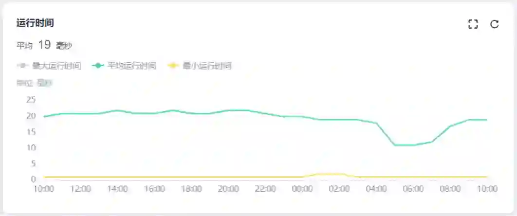 另外,为帮助用户掌握函数运行情况,FunctionGraph 为应用函数提供深度可视化的可观测能力,支持丰富的观测指标配置,包括调用次数、错误次数、运行时延等,如图 3 所示的函数运行时间监控示例。
