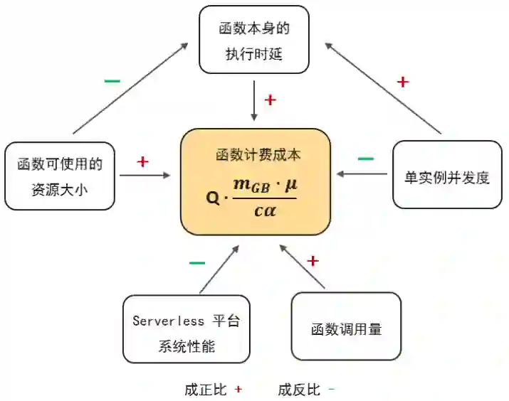 最后,图 8 对上述几个决定函数成本的关键因素做了一个总结,其中,箭头方向表示元素之间的直接影响,“+”号代表成正比,“-”代表成反比。