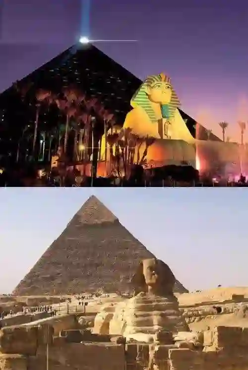 美国拉斯维加斯某酒店(上)与埃及金字塔、狮身人面像(下)