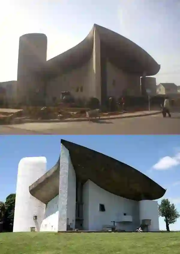 河南某经济技术开发区仿建朗香教堂(上)与法国朗香教堂(下)