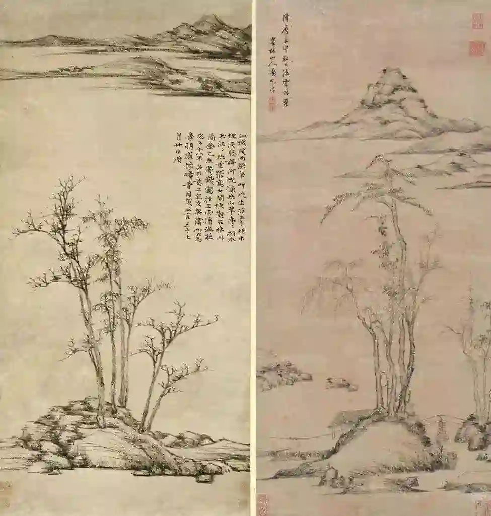 元代倪瓒《渔庄秋霁图》(左)与明代项元汴《仿云林笔意图》(右)