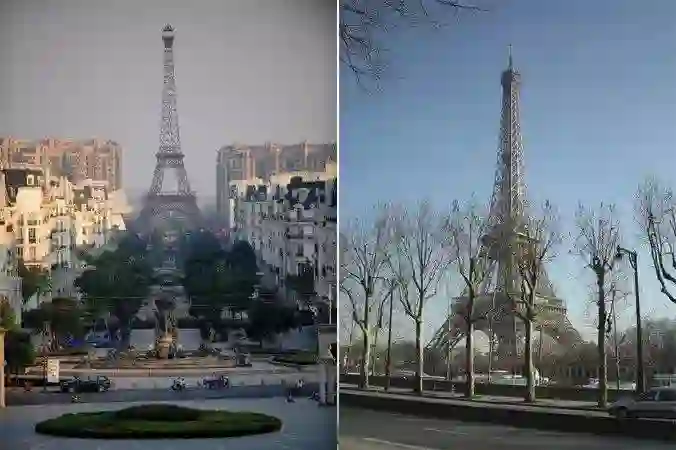 浙江杭州某小区铁塔(左)与巴黎埃菲尔铁塔(右)