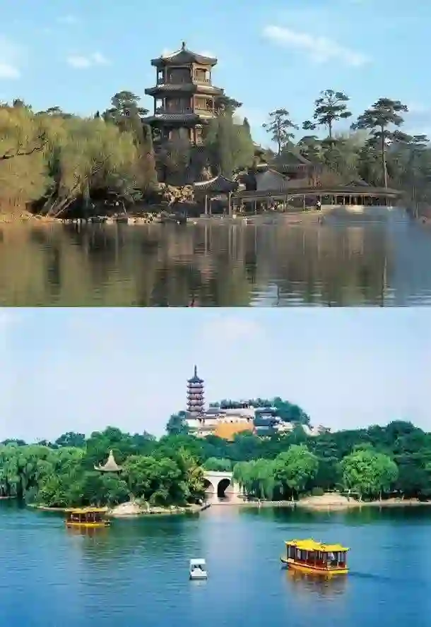 避暑山庄小金山(上)与镇江金山寺(下)