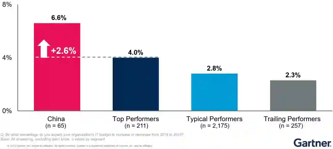 当前,一些人对中国的商业环境持谨慎态度。由于贸易摩擦,中国2019年的GDP增速预计将下滑至6%。但好消息是,中国的首席信息官表示,其平均IT预算实际上同比增加了6%以上。这表明未来中国将很有可能迎来颠覆性的业务赋能技术,而这些技术将对企业机构的未来发展带来至关重要的影响。