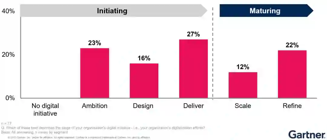 在成熟度方面,Gartner发现三分之一的中国企业机构已经拥有“成熟的数字化”。“数字化成熟”的企业机构的首席信息官能够提供更大的容量(处理能力)、规模(面向消费者的服务种类)以及敏捷性(快速变化的能力),且一直积极拓展其数字化业务。此外,超过五分之二(22%)的中国企业已更进一步,开始细化其数字化业务,并寻找新的机会。无论身处何种行业,这些新机会都会引来中国数字颠覆者的注意。而拥有数字化业务的企业也更加开放,已将颠覆者视作可为整个行业创造价值的合作伙伴或代理人。