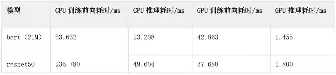 【性能测一测】通过比较resnet50和bert模型的训练前向耗时和推理耗时,可以观测到Paddle Inference有显著的加速效果。