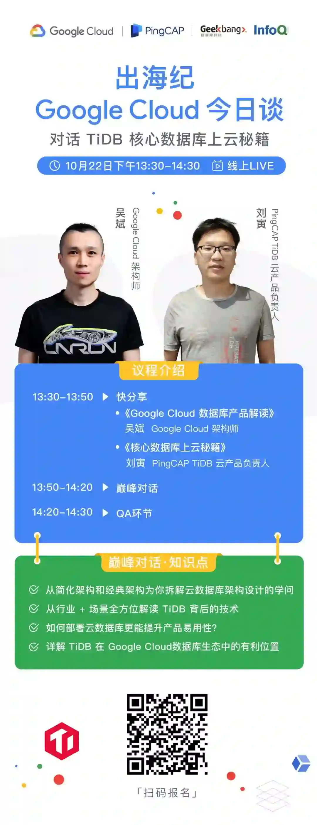 PingCAP 打造了国内第一个 NewSQL 开源项目——TiDB ,在核心数据库上云领域有着非常硬核的实战经验,而 Google Cloud 在云计算和大数据技术的落地实践上也是佼佼者,这一场强强碰撞的对话一定能给你带来更多关于数据库上云的思考、灵感!