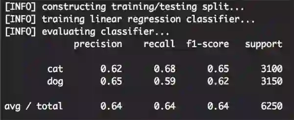 最后,我们在kaggle 狗vs猫的数据集上,利用Python, OpenCV, 和 scikit-learn进行线性分类。从数据集提取出颜色直方图之后,我们在特征向量上训练一个线性支持向量机,并且得到64%的分类精度,这已经很不错了,因为(1)颜色直方图并非狗和猫特征化的最佳选择(2)我们没有对线性SVM进行调参。