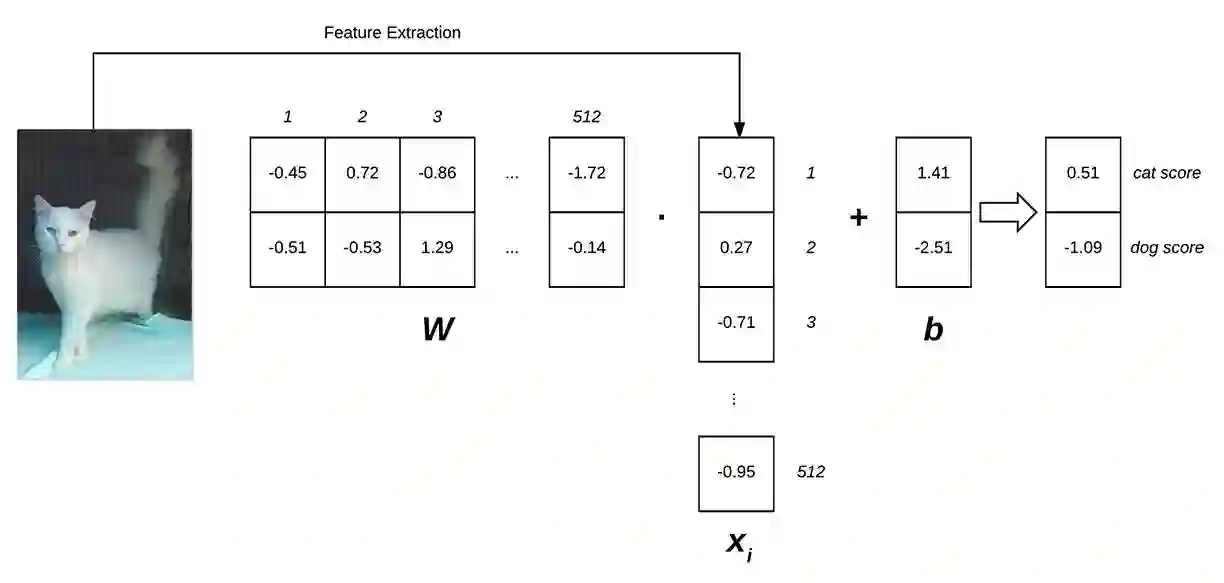 回到Kaggle的猫和狗例子中, 每个都表示为512维颜色直方图,因此的形状是[512 x 1]。权重矩阵W的形状为[2 x 512],而偏置矩阵b为[2 x 1]。